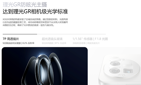 其搭载的理光GR防眩光主摄采用7P镜头结构+五层“超低反”镀膜(反射率低至0.2%),配合双层AR镀膜(透光率97%)及深吸收蓝玻璃,彻底解决手机街拍常见眩光问题。