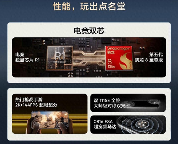 这次真我GT8 Pro首批搭载第五代骁龙8至尊版处理器,并且搭载电竞独显芯片R1,也将性能发挥到了极致,另外它搭配的是LPDDR5X规格内存,UFS4.1规格闪存。