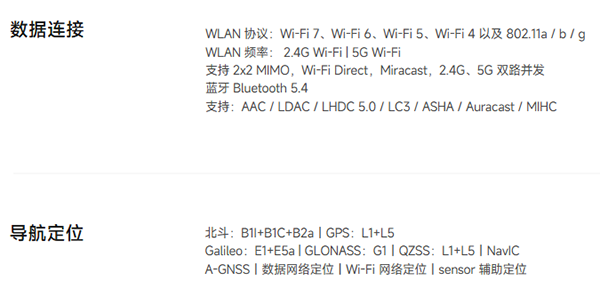 蓝牙方面,该机配置的是蓝牙5.4,并且支持AAC/LDAC/LHDC 5.0/LC3/ASHA/Auracast/MIHC。