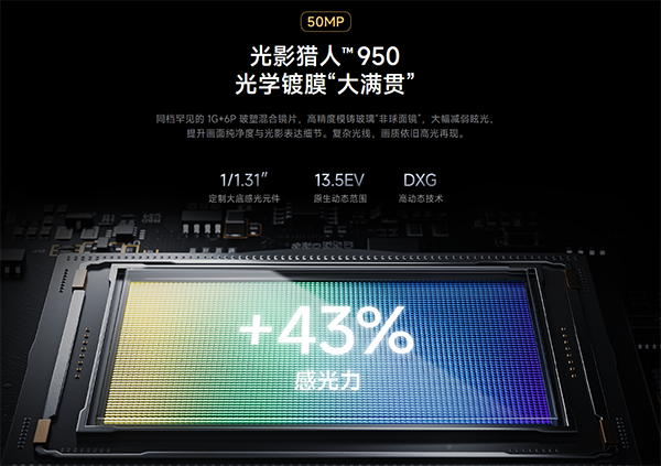 在影像方面,该机搭载REDMI迄今最1/1.31英寸超大底主摄“光影猎人950,光影猎人950传感器拥有13.5EV高动态范围,支持DXG高动态技术,逐片镀膜1G+6P玻塑混合镜片,可大幅减弱眩光。