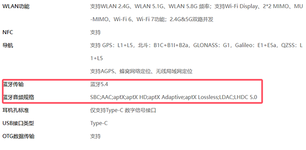 蓝牙方面,配置的是蓝牙5.4,蓝牙音频规格上支持SBC、AAC、aptX、aptX HD、aptX Adaptive、aptX Lossless、LDAC、LHDC 5.0。