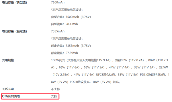 iQOO Neo11搭载了采用第四代硅负极技术的蓝海电池,电池容量高达7500mAh,并且支持100W有线快充,另外它还支持OTG反向充电,也就是有线反向充电。