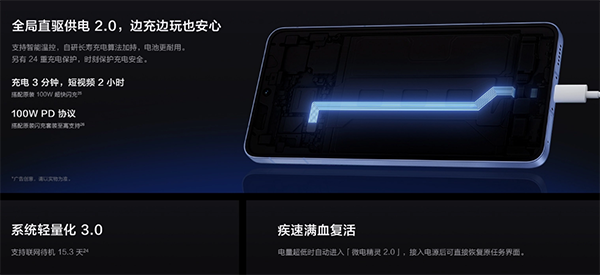 另外,配合100W超快闪充与全局直驱供电2.0技术,实现“充电3分钟,抖音2小时”的极速回血体验,同时边充边玩不烫手。