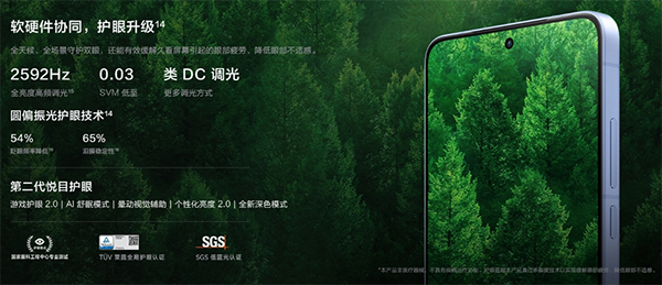 在这个护眼方面,屏幕支持2592Hz全亮度高频PWM调光与类DC调光,SVM值低至0.03,配合圆偏振光技术,真正实现“电竞不伤眼”。
