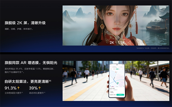 护眼方面,新机搭载圆偏振光护眼技术,全新升级悦目护眼2.0、iQOO15 同款硬件级游戏护眼,动态侦测游戏画面,智能调节蓝光量和亮度,支持类DC调光、2592Hz超高频调光。