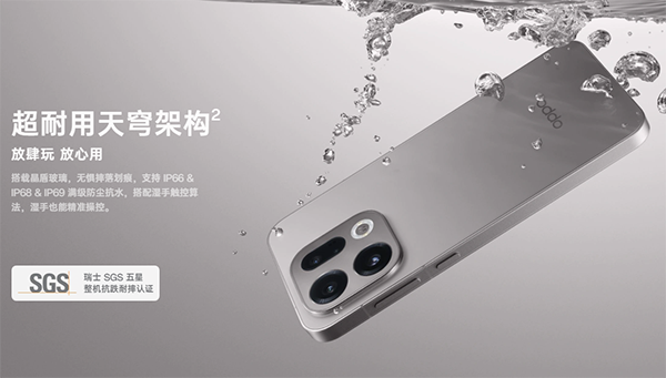 IP66+IP68+IP69级别,OPPO Find X9机身支持IP69+IP68+IP66满级防尘防水,获得瑞士SGS五星整机抗跌耐摔认证。