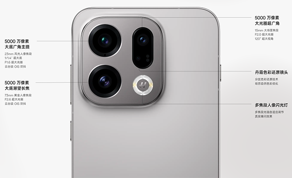 OPPO Find X9还有一颗与Pro机型相同的三星S5KJN5超广角镜头,5000万像素,1/2.75英寸,f/2.0光圈,拥有120°广视角,并且支持三轴EIS防抖。