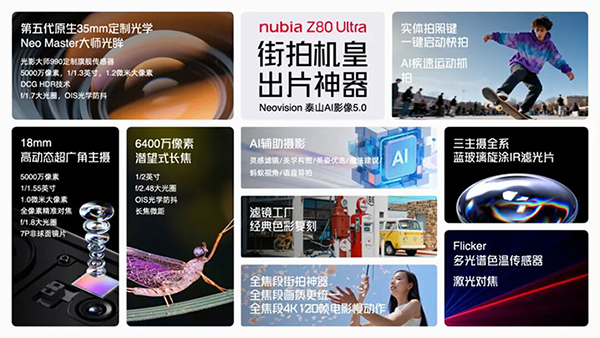 这次努比亚在影像方面的堆料非常足,努比亚和其他手机品牌不一样的是,没有去堆一英寸主摄,而是把重心放在了焦段和画质上,Z80 Ultra搭载了第五代原生35mm定制光学镜头,并配备了5000万像素、f/1.7大光圈,以及1/1.3英寸的“光影大师990”定制旗舰传感器。