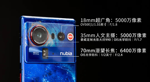 超广角摄像头:5000万像素,豪威OV50E传感器,1/1.55英寸,1μm,支持DCG HDR,F1.8光圈,OIS光学防抖,等效焦距18mm,7P镜头,蓝玻璃旋涂IR滤光片;