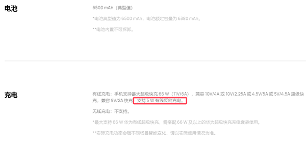 也就是说,华为Mate70 Air配置的是6500mAh电池,并且支持的是66W有线快充,不支持无线充电功能,但支持5W有线反向充电。