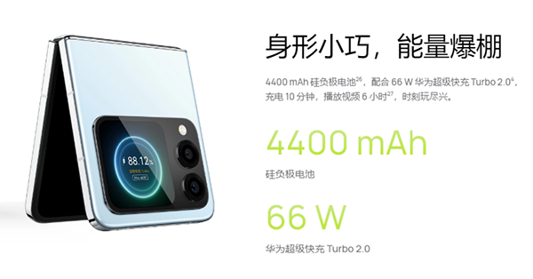 在电池方面,这个华为nova Flip S内置4400mAh电池,支持66W有线快充,能够快速充电满足日常使用需求。