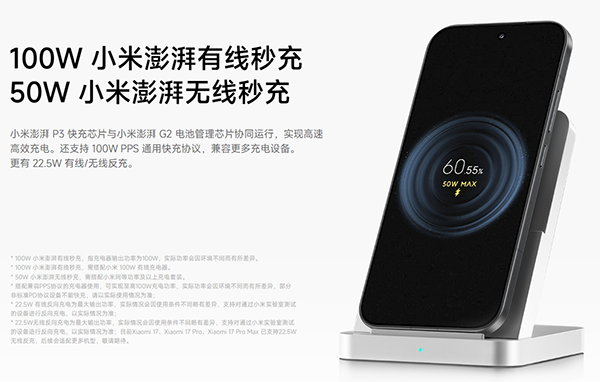 也就是说,小米17配置的是7000mAh小米金沙江电池,并且支持100W的有线充电和50W的无线充电,但是它不支持旁路充电功能。