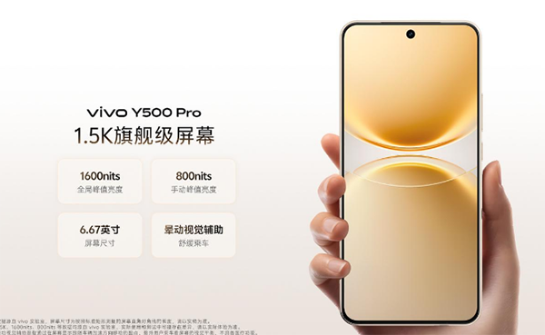 vivo Y500 Pro正面是一块6.67英寸的1.5K OLED直屏,边框极窄,支持1600尼特的峰值亮度和3840Hz超高频PWM调光,对眼睛更加友好。