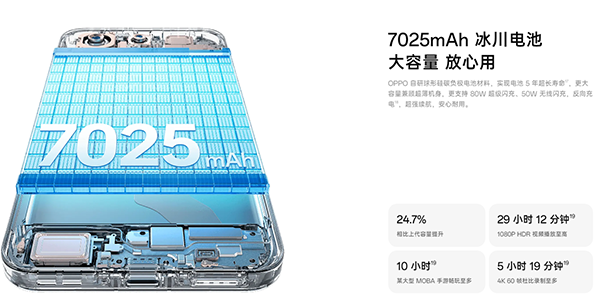 也就是说,OPPO Find X9机身中内置了7025mAh超大容量冰川电池,并且是单电芯单接口设计方案。
