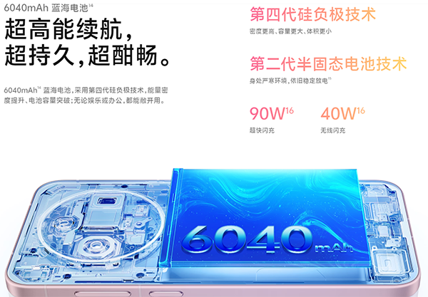 vivo X300内置的第二代半固态蓝海电池拥有6040mAh大容量,能量密度是875Wh/L,足以支持一天使用,90W超快闪充随时“回血”,还有40W无线闪充,随放随充很方便。为了延长手机续航时长,该机还内置全场景能效调度2.0,构筑全场景的长续航体验。