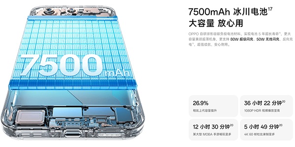 在这个电池方面OPPO Find X9 Pro终于是用上了超大容量电池,这一代的容量来到了7500mAh,搭配80W有线快充和50W无线快充,在续航体验这一块算是市场中的T1水准。