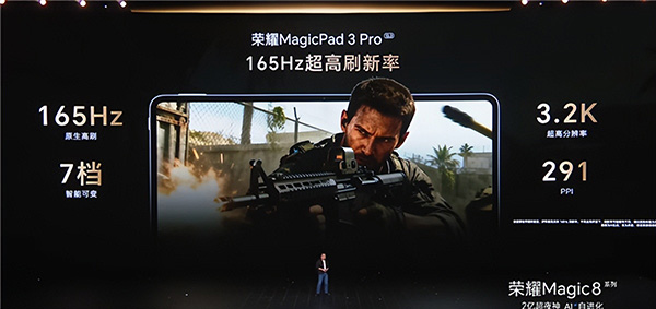 荣耀MagicPad3 Pro提供星空灰、浮光金、月影白三款配色,正面为13.3英寸165Hz高刷护眼屏,分辨率为3200*2136,行业首发PC级Q-Sync技术,实现屏幕刷新率与帧率对齐。