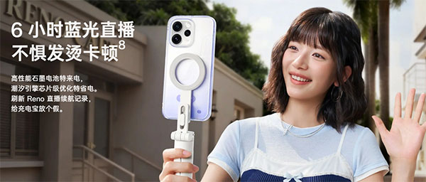出门想要放心拍摄,手机的续航能力就非常重要了,OPPO Reno15 Pro配备一块6500mAh超耐用大电池,高性能石墨电池和潮汐引擎的双管齐下,官方表示能保障6小时的流畅直播。