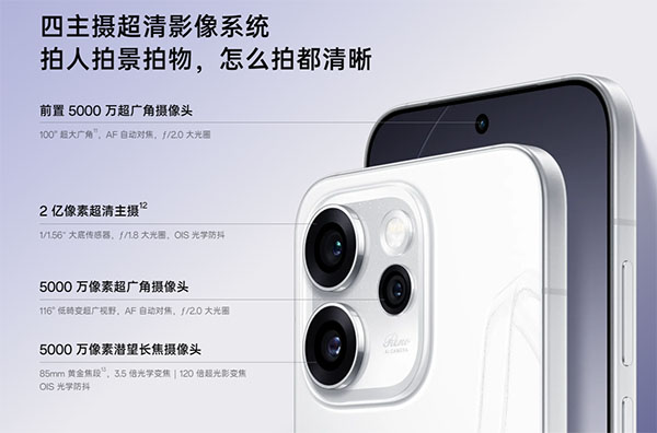 另外辅以5000万像素超广角镜头和5000万像素潜望式长焦镜头,覆盖从广角到远摄的全焦段拍摄需求,前置摄像头同样为5000万像素。
