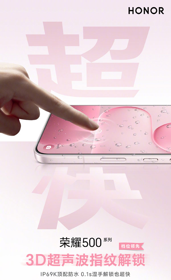 荣耀500 Pro搭载3D超声波指纹,并且支持IP68+IP69+IP69K顶配防水,湿手解锁仅需0.1s,实现了档位领先的解锁体验。