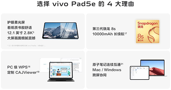 总的来看,这个vivo Pad5e是一款以学习办公为主的全能平板,考虑到用户长时间使用的需求,vivo Pad5e采用了更护眼的柔光大屏,而且配备了第三代骁龙8s平台以及10000毫安时电池,确保性能与续航方面有着同级领先的表现,对于学生和办公用户来说,vivo Pad5e是一款非常值得关注的产品。
