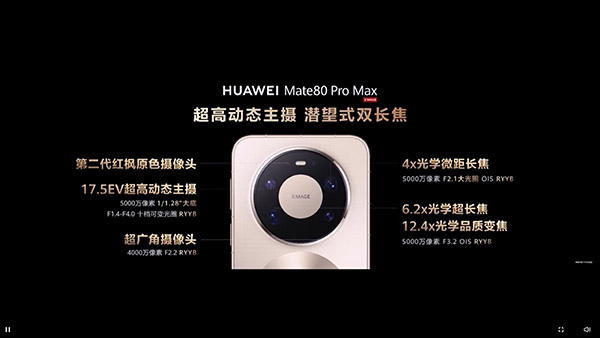 在这个影像的配置上,这一代的华为Mate80 Pro Max配置的是5000万像素可变光圈主摄(1/1.28英寸)+480万像素4X潜望长焦(支持微距)+5000万像素6.2X潜望长焦+4000万像素超广角+第二代红枫原色摄像头。