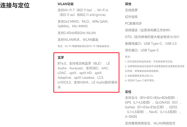 蓝牙方面,该机配置的是蓝牙6.0,支持低功耗蓝牙(BLE)、LE Audio、Auracast,支持SBC、AAC、LDAC、aptX、aptX HD、aptX Adaptive、aptX Lossless、LC3、LHDC5.0,支持ASHA、LE Audio助听器协议。