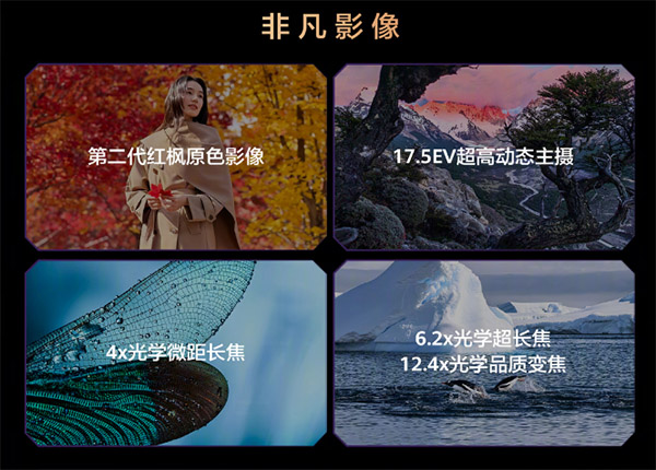它搭配5000万像素双长焦,4倍超聚光微距长焦、6.2倍超长焦,支持12.4倍光学品质变焦,中长焦视频清晰度较前一代提升78%,超长焦视频清晰度较前一代提升182%。