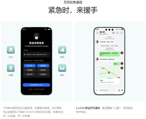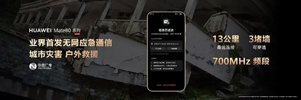 余承东在发布会上表示:“当自然灾害发生以后,如果地面网络没有信号,或者基站瘫痪以后,我们最远能够覆盖超过13公里的通信距离,可以穿透三堵墙,救援队拿着救援手机可以和Mate80系列手机进行无网的通信应急救援,多一份连接,多一份希望。”