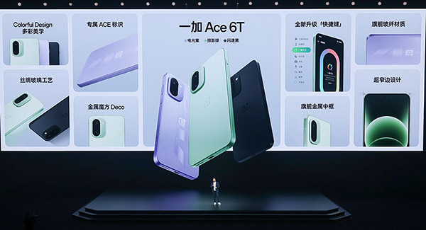 在外观设计上一加Ace6T,推出掠影绿、闪速黑、电光紫三款配色,其中掠影绿和闪速黑采用丝绸玻璃工艺,触感细腻且不沾指纹,配色精致优雅。