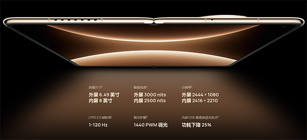 华为Mate X7的屏幕体验同样拉满:6.49英寸OLED外屏(2444×1080分辨率)与8英寸超高分辨率OLED内屏(2416×2210分辨率),分别达到3000nits与2500nits峰值亮度,双屏均支持1-120Hz自适应刷新率,无论强光弱光都能呈现清晰细腻的视觉效果。