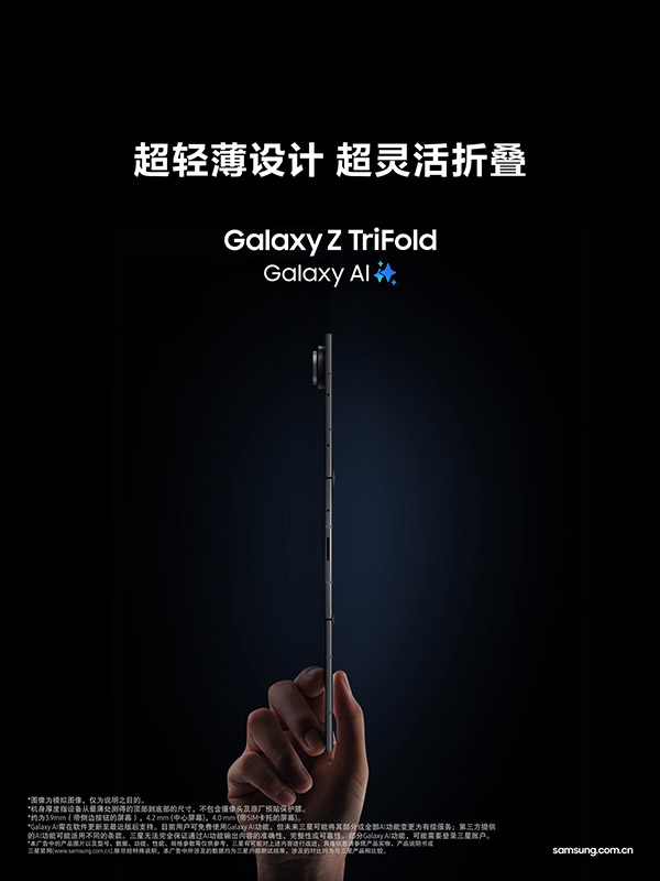 三星Galaxy Z TriFold延续Z Fold7的硬朗纤薄商务风格,机身以直线元素为主,闭合时顶底双端棱角分明、严丝合缝,呈现几何美感。其采用U型折叠方式,以中间屏幕为基点,两侧区域均向内折叠。