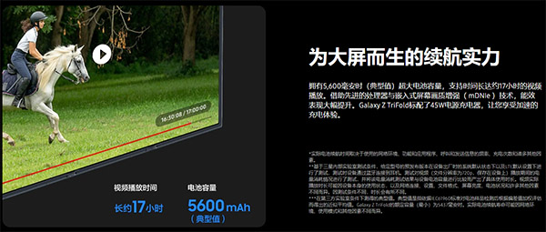 手机的续航上怎么样,我会主要就是看这个电池和充电的配置了,一般这个电池容量是越大,续航就越持久,而充电功率是越大,充电速度就越快了,那这次的三星Galaxy Z TriFold电池容量和充电功率是多少瓦呢,下面将带大家来看看介绍。