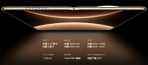 屏幕作为折叠屏的核心交互载体,同样达到旗舰级水准,内外屏均搭载华为最新的临境显示技术,外屏:6.49英寸OLED,2444×1080,高达3000 nits峰值亮度;内屏:8英寸OLED,2416×2210,最高2500nits。