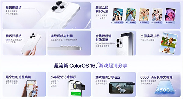 其他:NFC,红外遥控,Wi-Fi 6(802.11ax),蓝牙5.4,IP69+IP68+IP66级别防水,预装基于Android的ColorOS16操作系统。