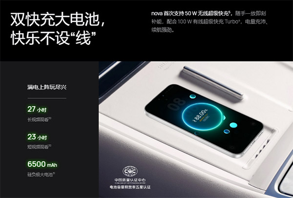 在续航方面,这次的华为nova15 Ultra内置6500mAh电池,支持100W有线超级快充、50W无线充电和7.5W无线反向充电。