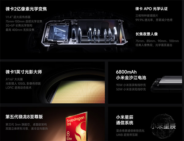 手机内置小米澎湃T1系列通信芯片,并集成UWB超宽带天线,支持最新的Wi-Fi 7协议与5G-Advanced蜂窝网络标准,首次实现了北斗与天通双卫星通信支持,在无地面网络的环境下也能保持通信连接。