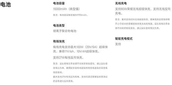 也就是说,荣耀Win配置的是10000mAh青海湖电池,并且支持100W的有线快充+80W无线充,另外还支持无线反向充电,以及27W有线反向充电。