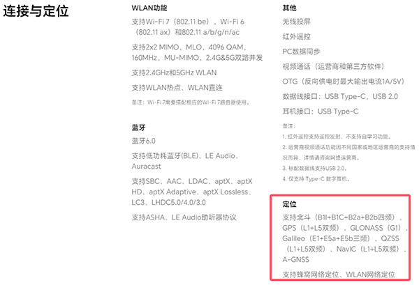 双频GPS(L1+L5)和四频北斗(B1I+B1C+B2a+B2b),在导航参数上,该机配置的是四频北斗(B1I+B1C+B2a+B2b)和双频GPS(L1+L5)、GLONASS(G1)、Galileo(E1+E5a+E5b三频)、QZSS(L1+L5双频)、NavIC(L1+L5双频)、A-GNSS,支持蜂窝网络定位、WLAN网络定位。