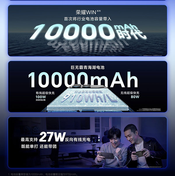 续航方面,全系机型均内置了10000mAh的大容量电池,搭载能效增强芯片,支持最高100W有线快充,其中,荣耀WIN版本额外支持80W无线充电。