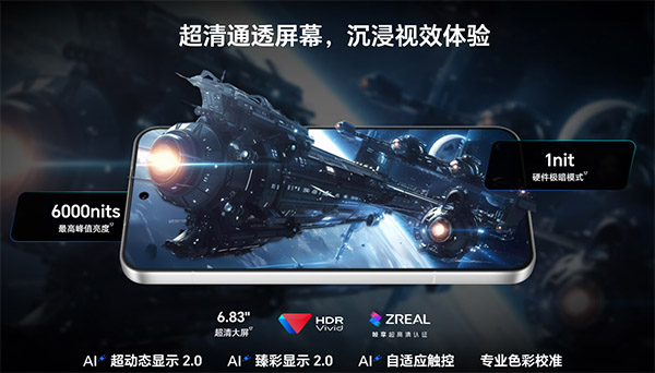 荣耀Win RT这块6.83英寸的屏幕相当顶级,分辨率为2800X1272,屏幕ppi达到450,亮度可调整空间从1nit-6000nits,最高刷新率为185Hz,HDR VIVID全链路画面控制以及专业的色彩校准,绝对称得上是“电竞神屏”。