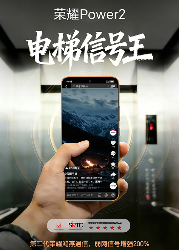 在通信上,这次的荣耀Power2被官方称为“电梯信号王”,搭载了第二代鸿燕通信技术,具备行业顶级的天线规格,能够增强弱网信号200%。