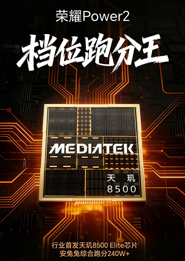 芯片层面,荣耀Power2首发搭载全新次旗舰芯片天玑8500 Elite,采用全大核架构,提供强劲的性能支撑,满足户外复杂场景下的多任务处理需求。