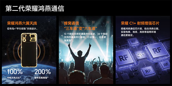 有,荣耀Power2搭载鸿燕六翼天线与自研射频增强芯片C1+,25根天线实现100%中框覆盖,弱网信号提升200%,通过SRTC电梯强信号与精准导航双五星认证。