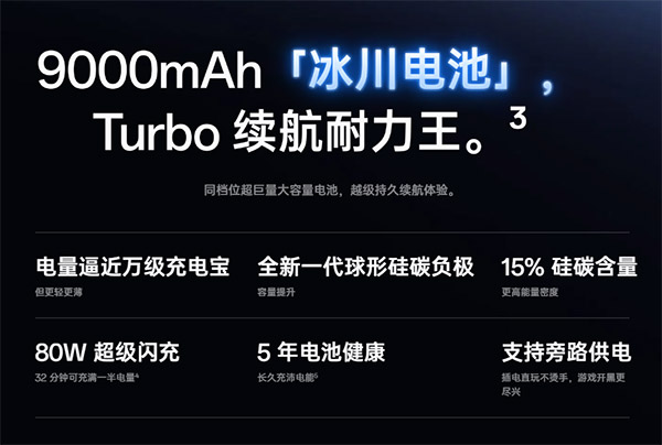 一加Turbo6V配备9000mAh冰川电池,Turbo档有史以来最大的电池。电池使用五年后仍有80%以上电池容量保持率。
