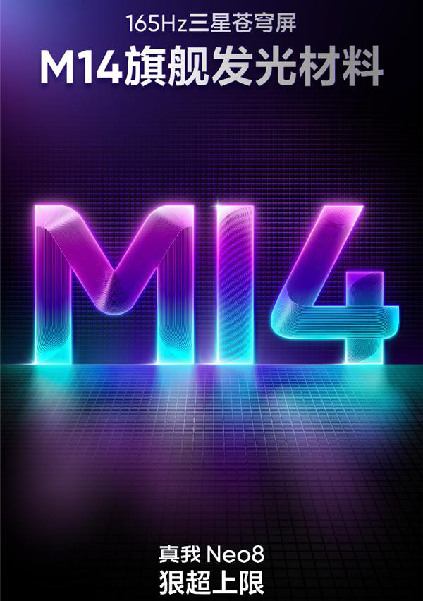 三星M14发光材质的OLED屏,realme真我Neo8这次找三星显示独家定制了一块屏幕,165Hz高刷新率,M14发光材料,同价位最顶,也就是屏幕供应商是三星了。