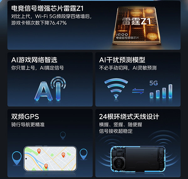 同时还配备多项网络辅助功能,包括AI游戏网络智选、AI干扰预测模型、双频GPS以及24根环绕式天线。