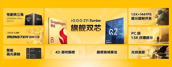 在核心性能方面,iQOO Z11 Turbo搭载第五代骁龙8移动平台与自研电竞芯片Q2,构成“同档唯一双芯”组合。