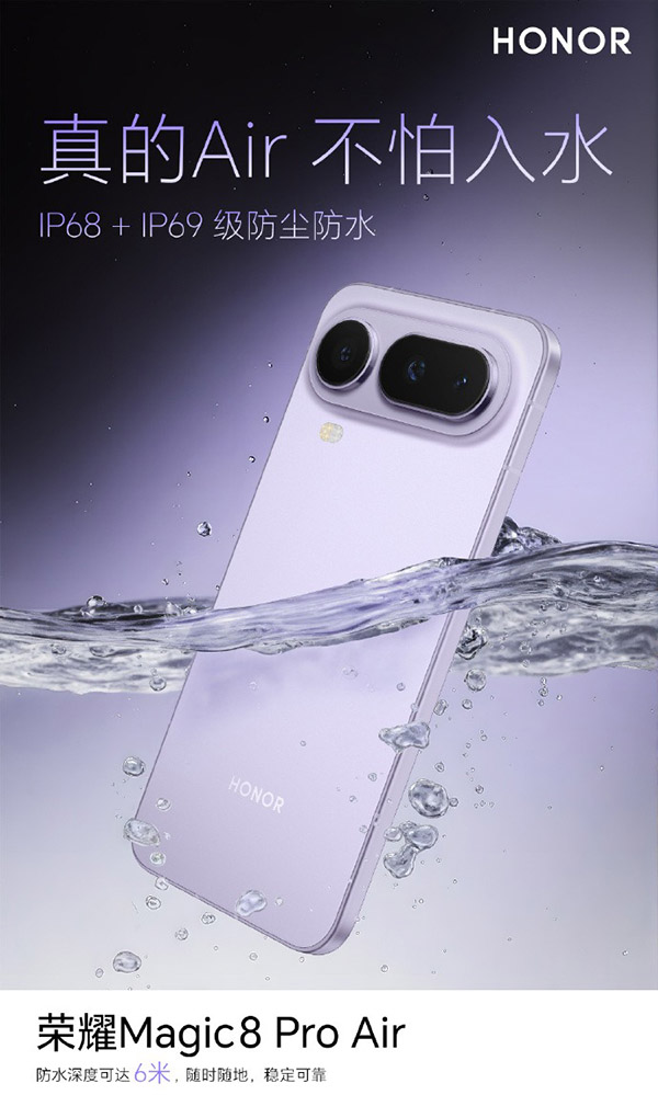 手机的核心方面,这个防水规格也是相当重要的,不同的机型,配置的防水级别也是不一样的,这次的荣耀Magic8 Pro Air属于是主打轻薄的,那它的防水级别是多少呢,下面带大家来看看具体的介绍吧。