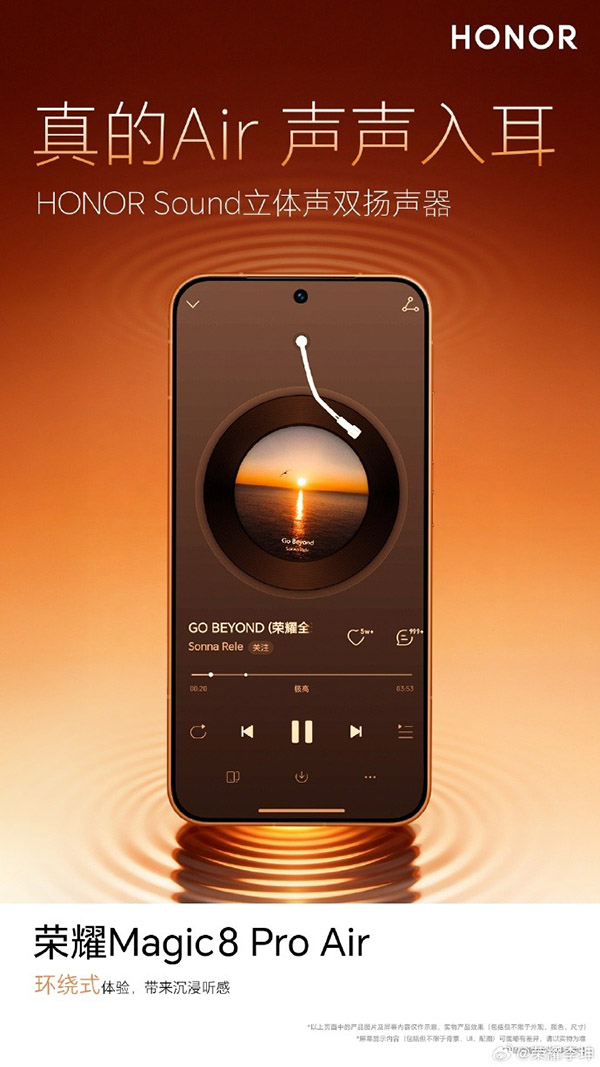 也就是说,荣耀Magic8 Pro Air配置的是立体声双扬声器,为用户带来了沉浸式的音质体验。